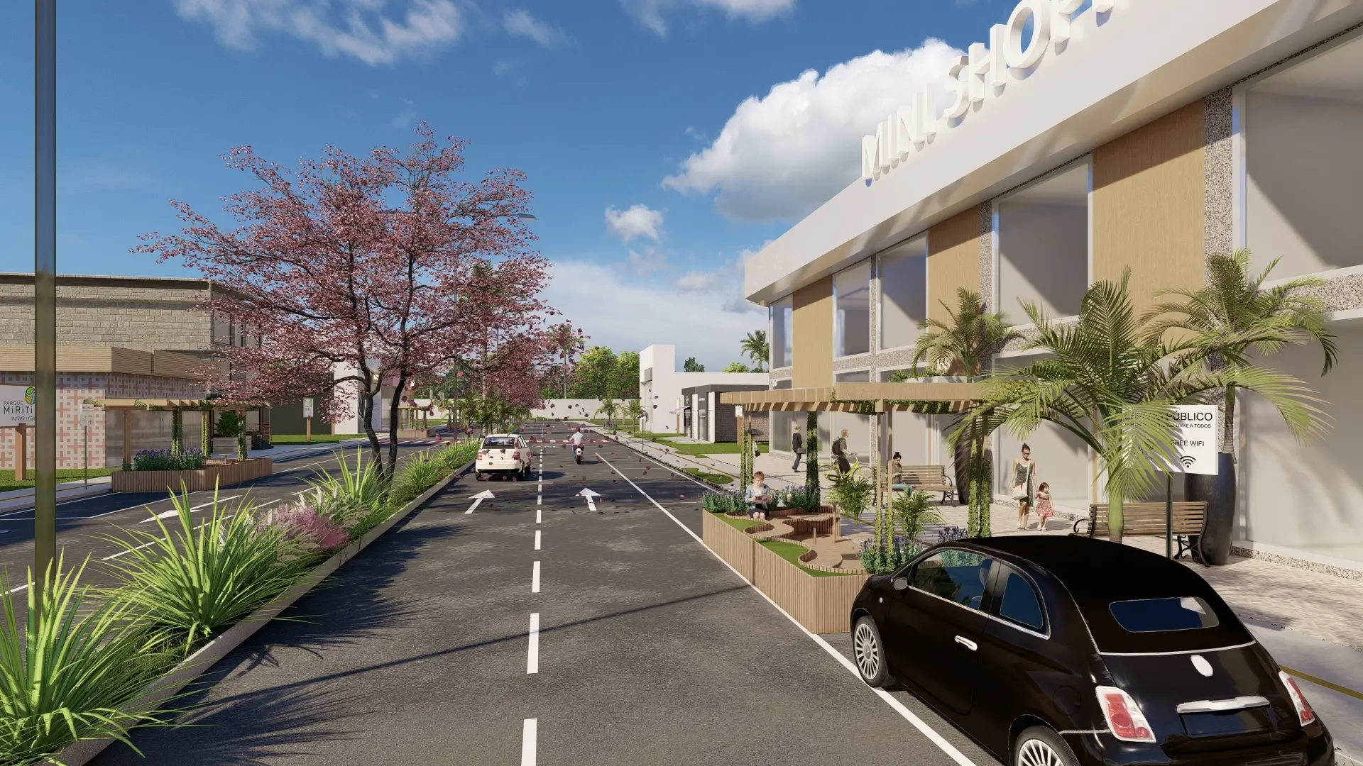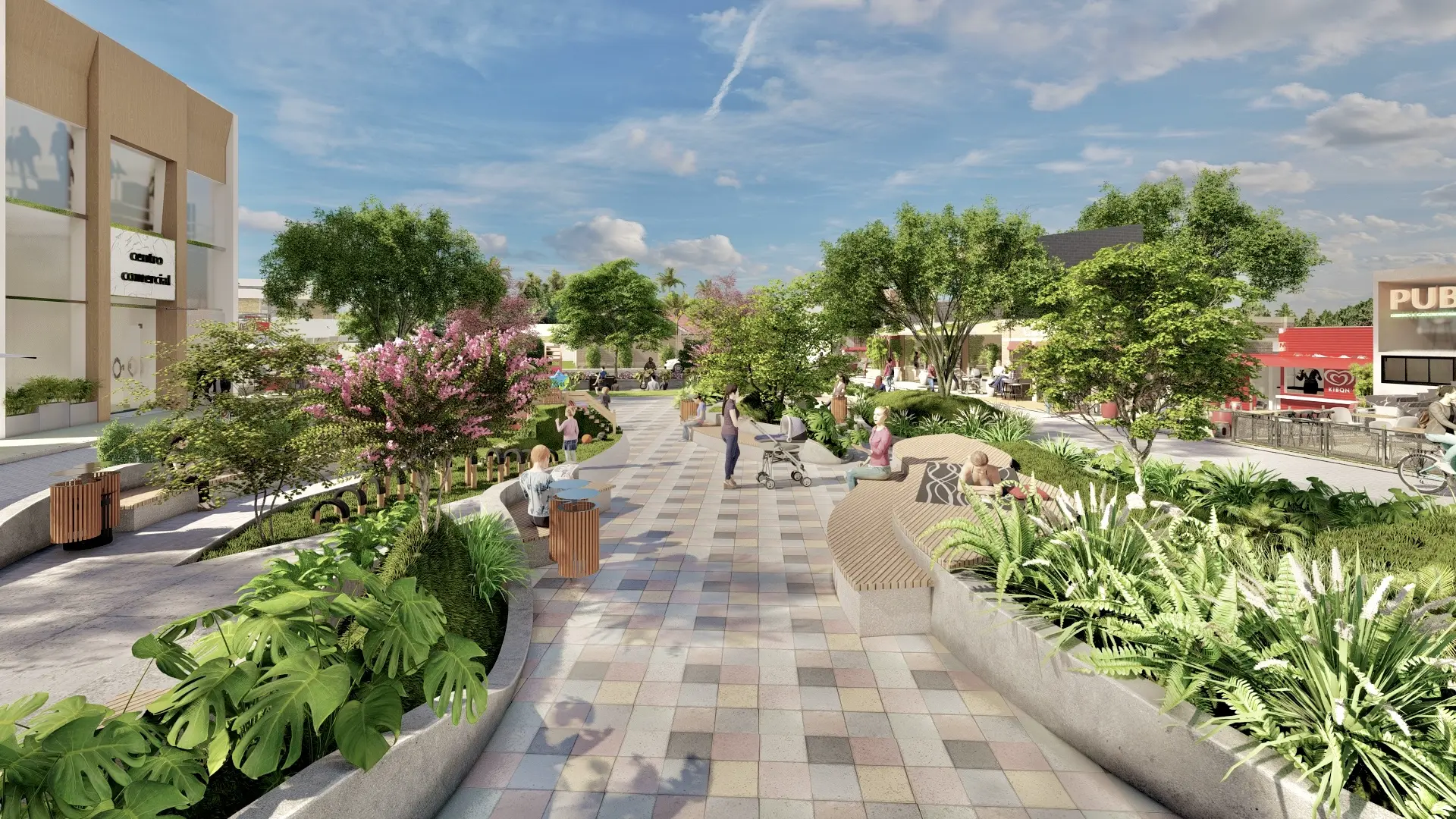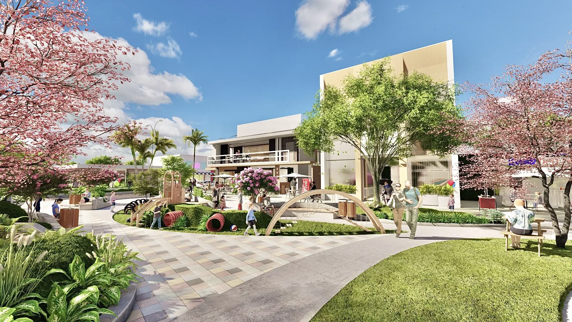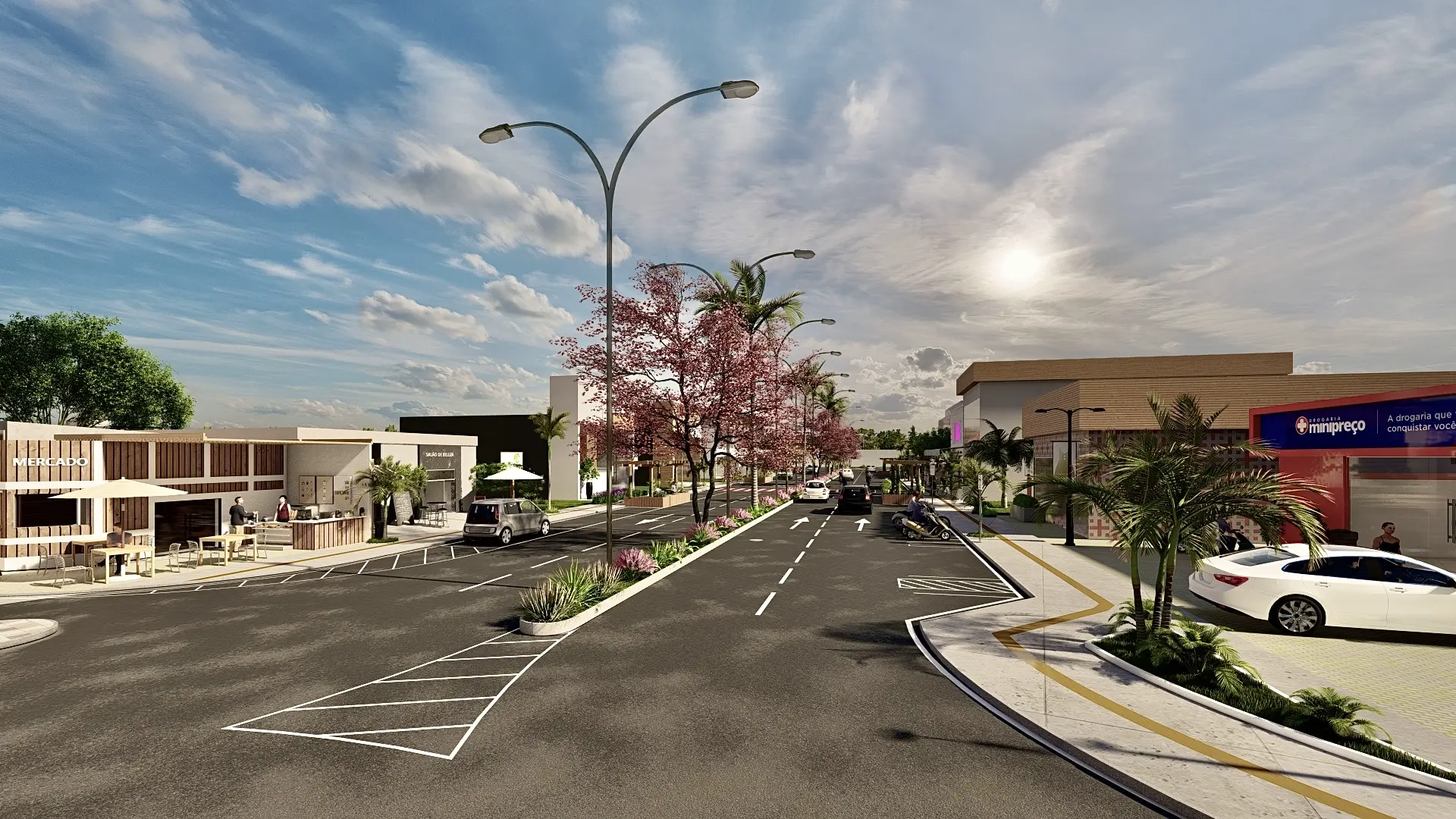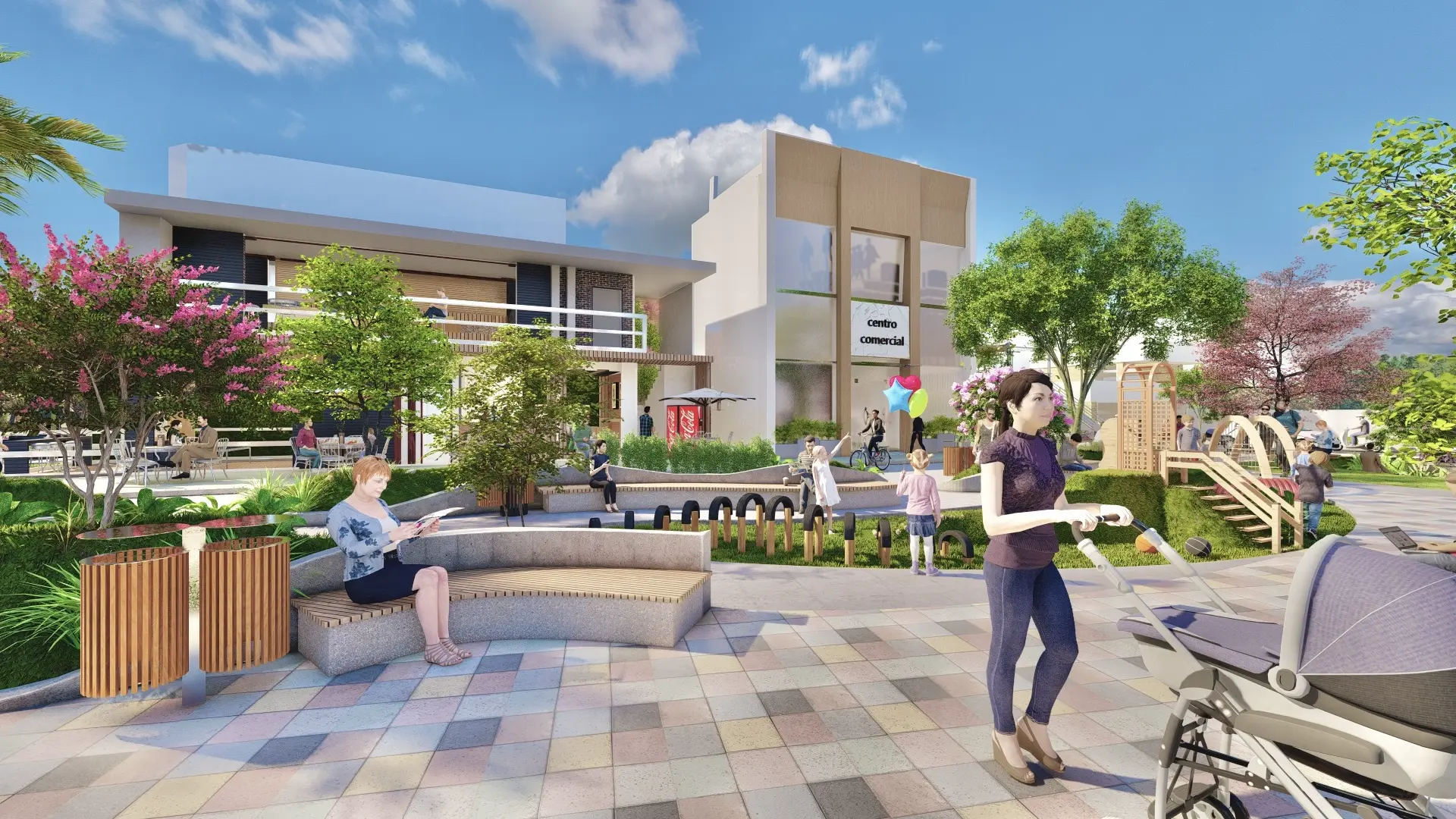 Destaque para o Pórtico na entrada e o Pet Park para os animais de estimação. A rua do comercio está repleta de lojas, cafés e restaurantes, e a Praça Central abriga eventos com uma atmosfera positiva.